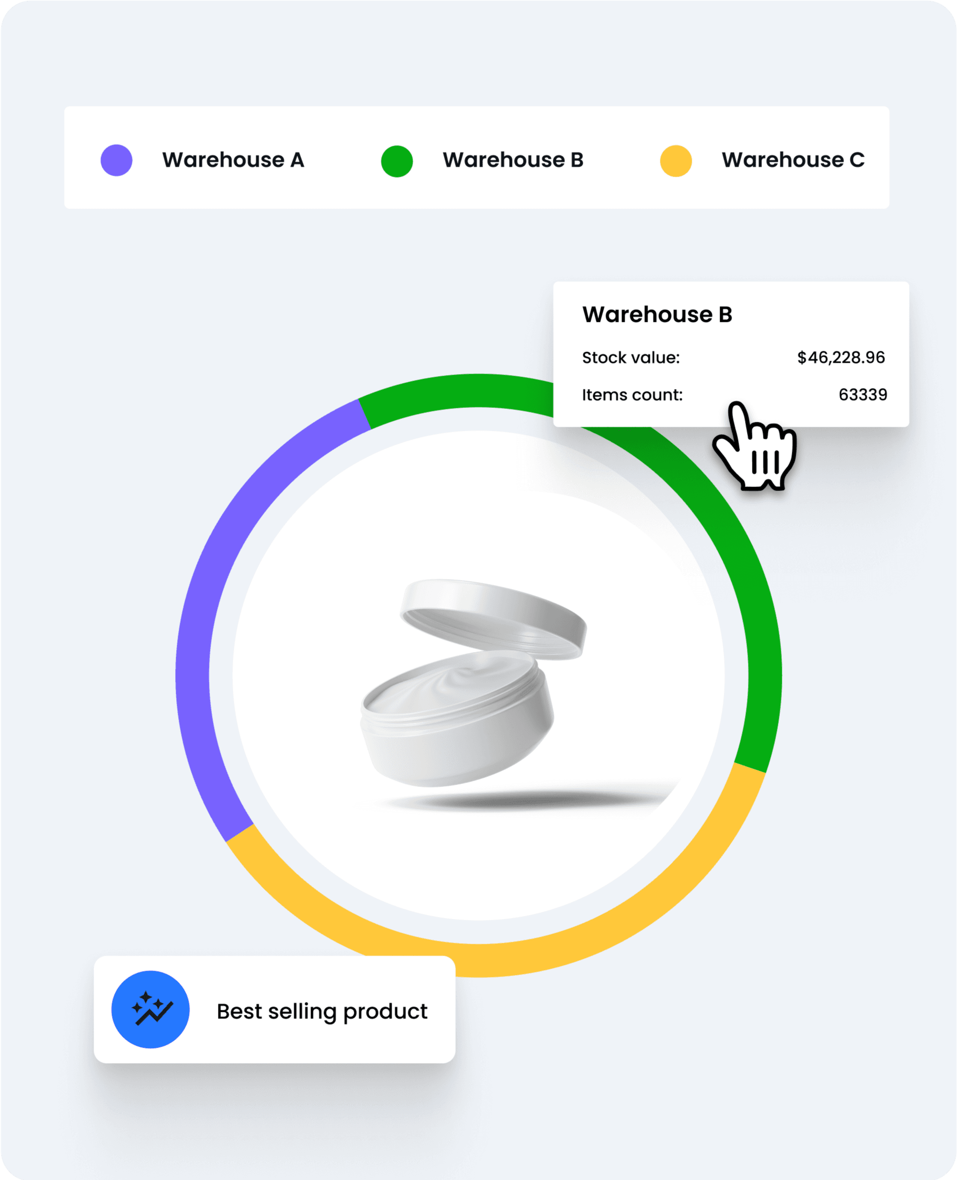 Keep track of your total inventory quantity (by SKU) and the value of your inventory by warehouse location. Compare inventory value across multiple locations and always know what inventory to store.