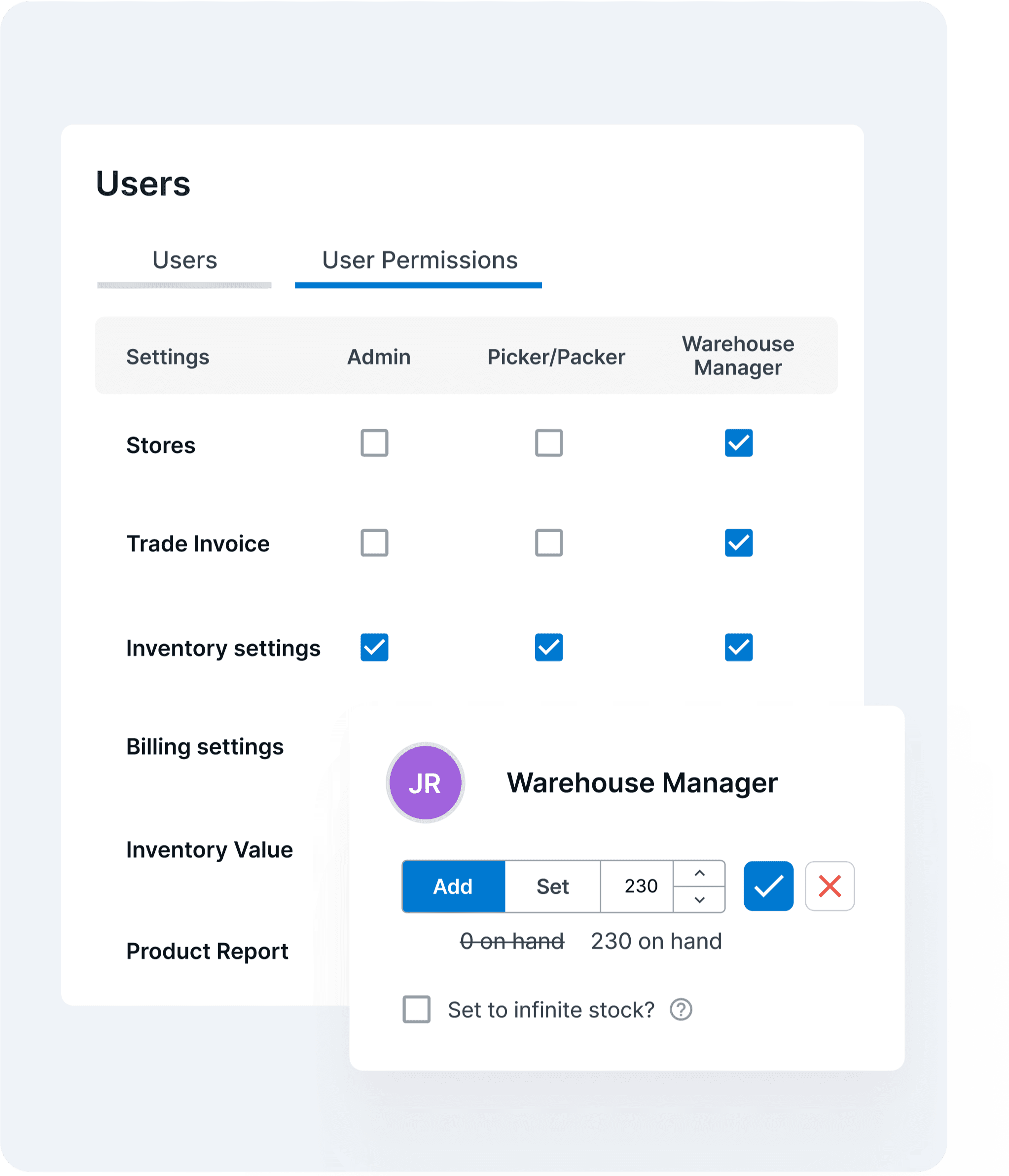 Adjust account permissions for your team based on preset user roles in Veeqo (Admin, warehouse manager, customer service manager, etc.) or by feature permissions in Veeqo such as: