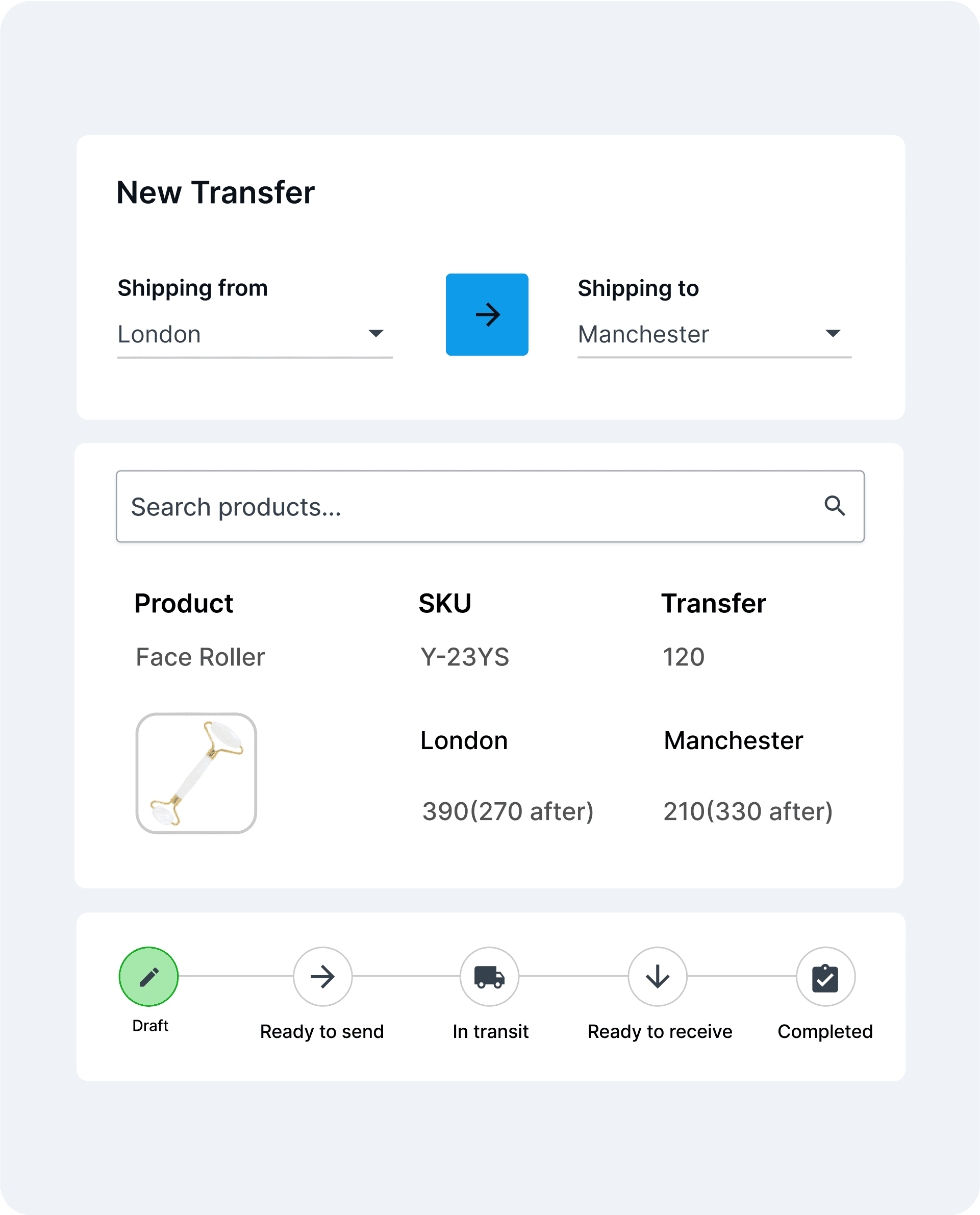 Transfer stock to other locations and track changes in available stock levels made from sales, purchase orders, location transfers, inventory counts and more.