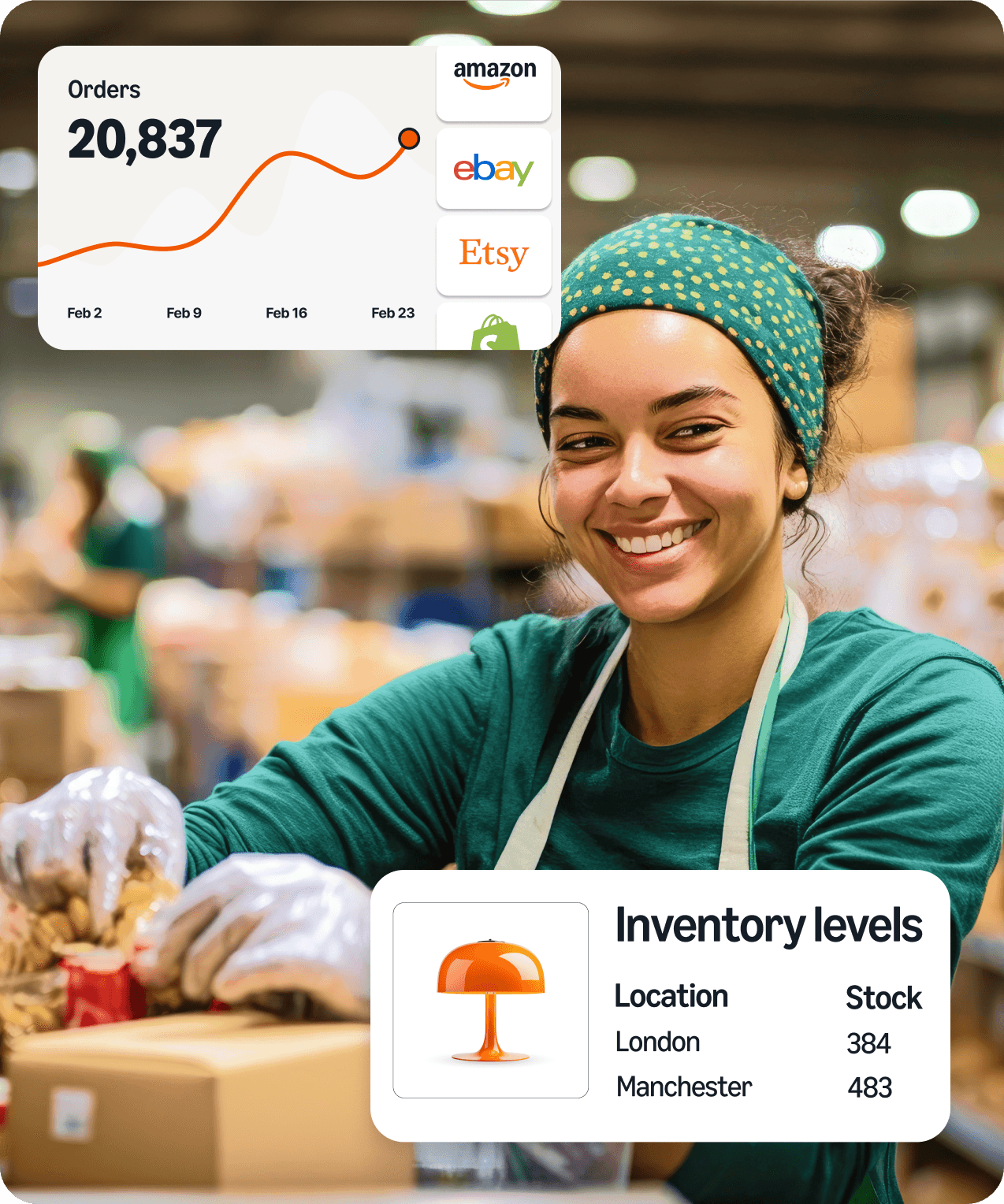 Veeqo automatically pushes accurate inventory levels to your channels including Amazon, eBay, Shopify and more. No more overselling or underselling. You'll always know: