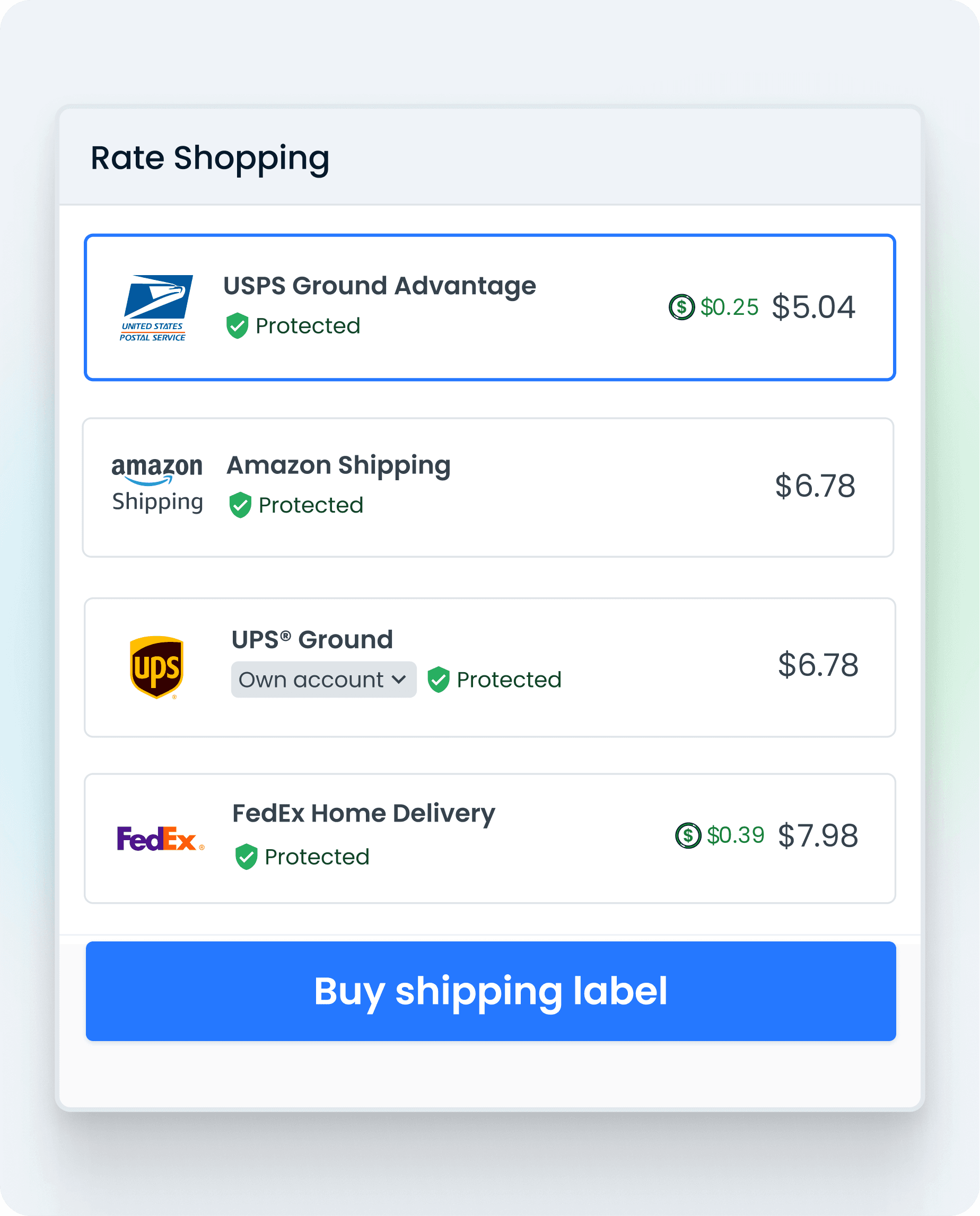 Our rate-shopping automatically finds the lowest shipping rate available based on size and weight, saving valuable time when fulfilling each order.