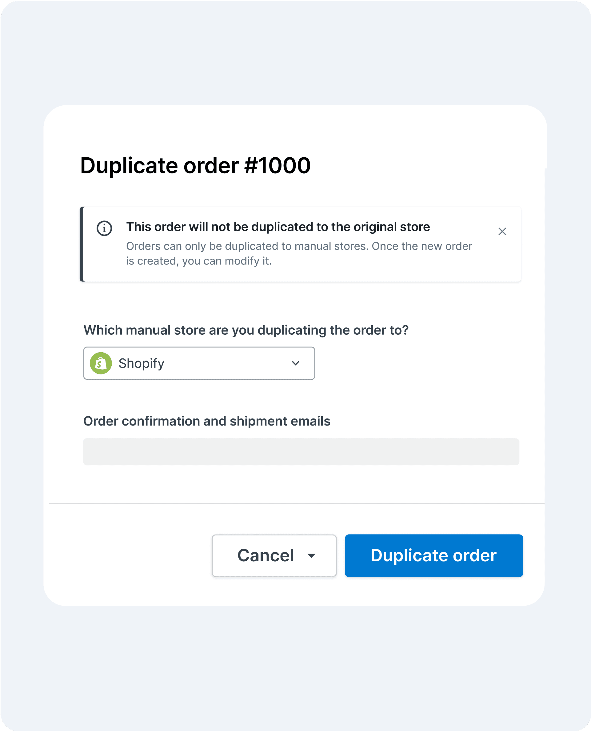 Instead of manually creating similar orders you can save time by duplicating another order, whether it was sold in Amazon, Ebay, Etsy, or Shopify.