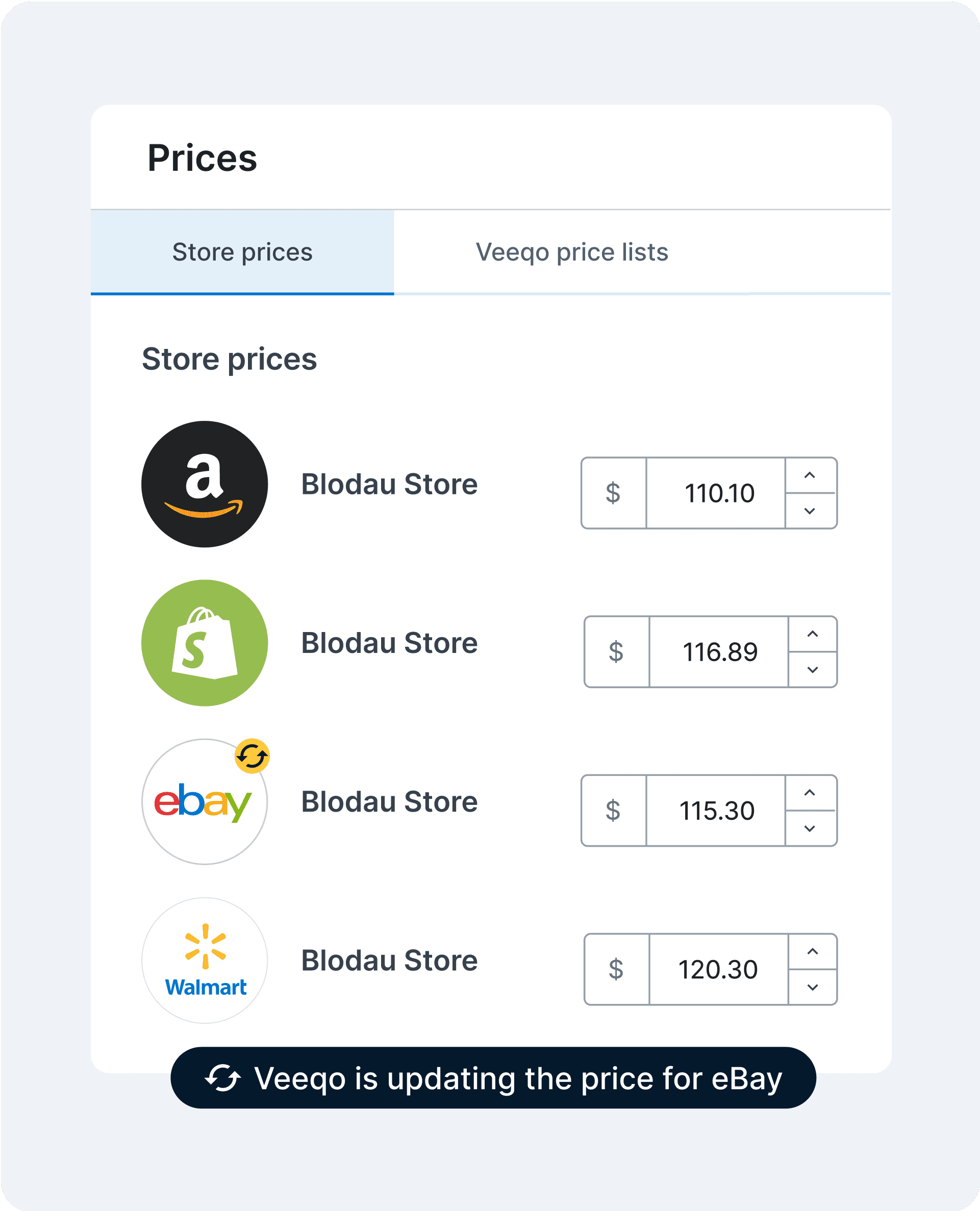 Easily update the prices for your products in Veeqo and push the prices across Amazon, eBay, Shopify, WooCommerce, Magento, Bigcommerce, Etsy, Walmart and more.
