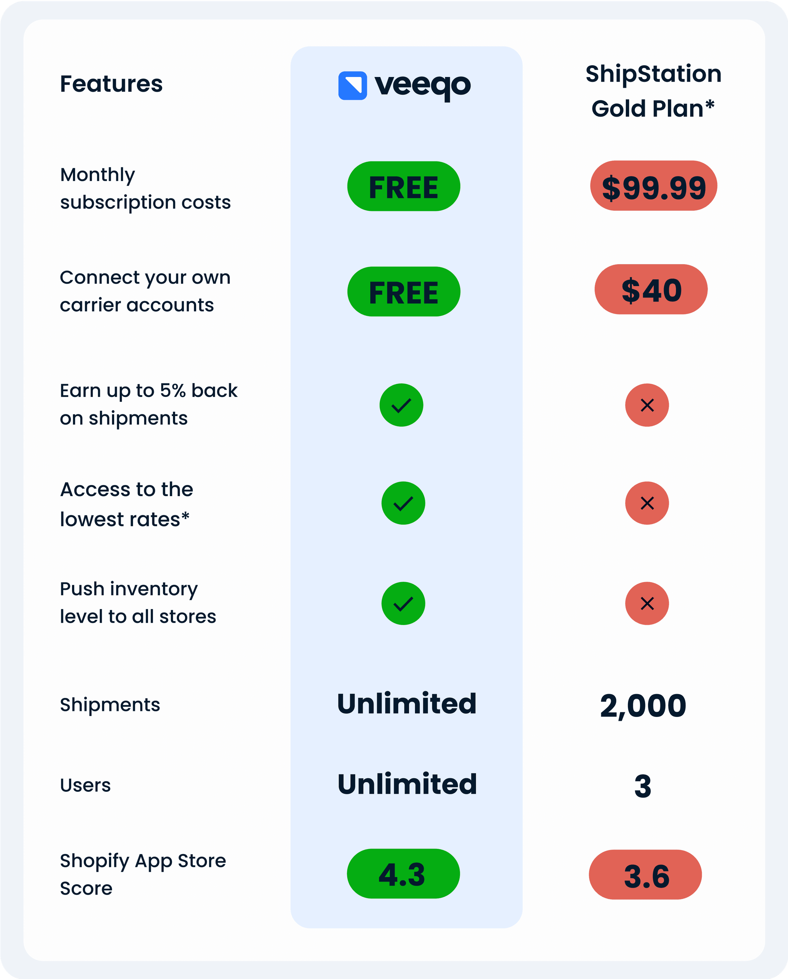 Pick, pack and ship your orders in Veeqo with the lowest rates* and up to 5% back. Access all the features you use in your current shipping software, without the price tag.