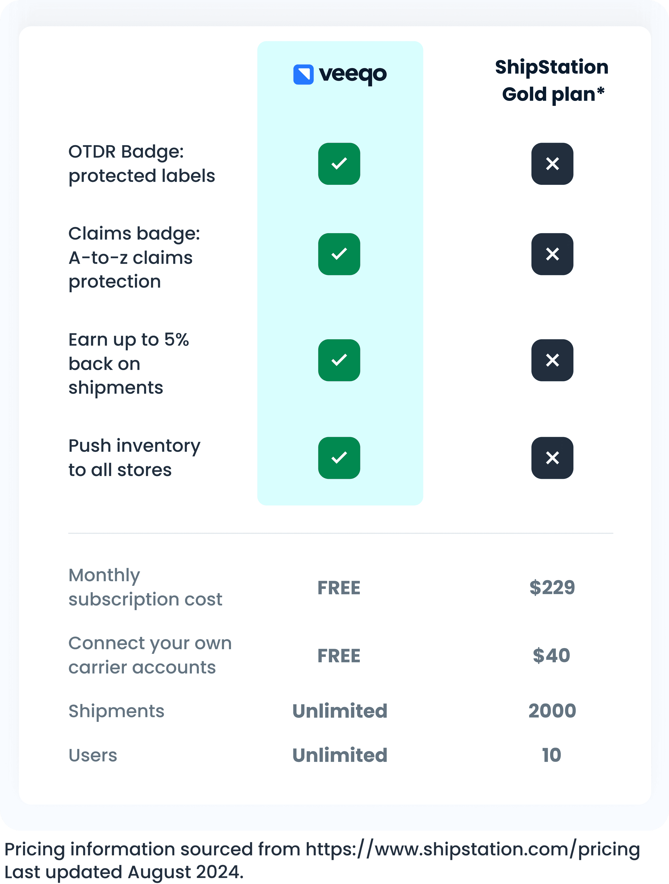 *Access to the lowest commercially available rates is based on our pre-negotiated pricing from UPS, USPS, FedEx, and DHL with up to 5% back in Veeqo Credits. This gift card is valid only for new Veeqo sellers who meet all eligibility requirements. The referral code associated with this offer cannot be forwarded or transferred to others. Previously forwarded referral codes are not eligible for use with this promotion. Veeqo reserves the right to verify eligibility and deny the offer if requirements are not met.